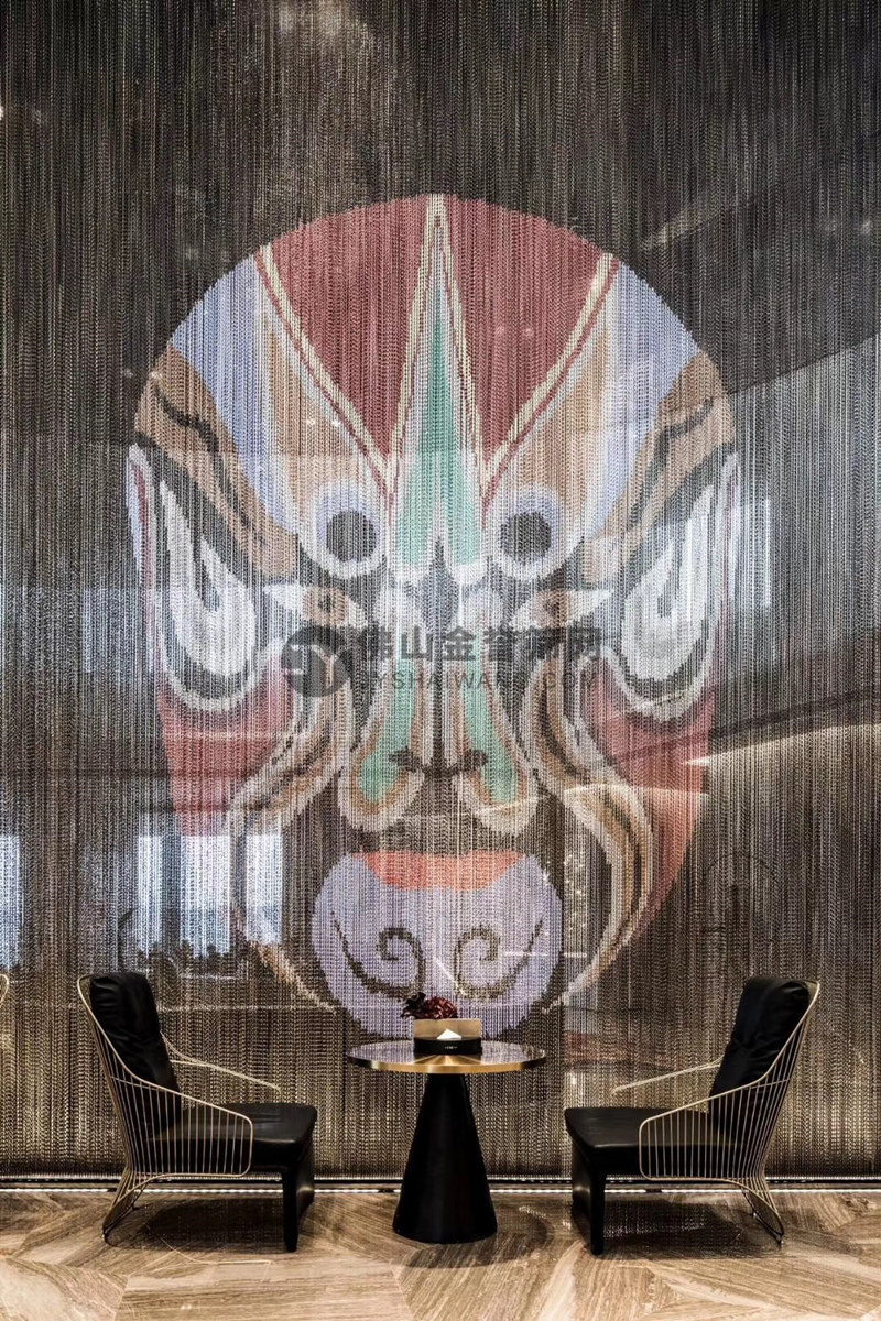 金屬垂簾采用優(yōu)質(zhì)鋁合金絲,銅絲,不銹鋼絲等編織,成品可以是金屬本來的顏色,也可以噴圖成古銅,烏木黑,棗紅等其他顏色,寬度、高度可以隨意定。該產(chǎn)品具有莊重,大方,立體效果好等特點(diǎn),在燈光照射下更顯魅力,是現(xiàn)代賓館,飯店,展廳等理想的裝飾材料。